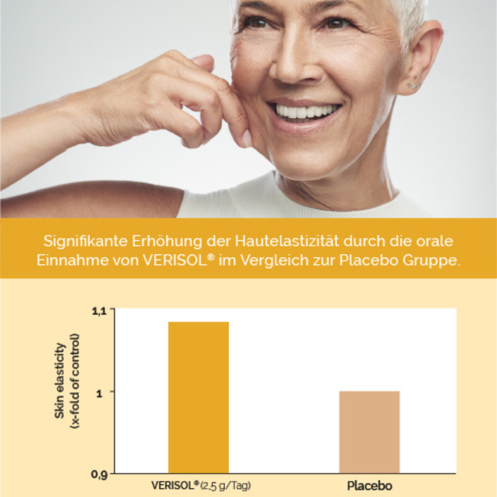 In einer placebokontrollierten Doppelblindstudie mit über 60 Frauen im Alter von 35–55 Jahren wurde die Wirkung von 2,5 g VERISOL® Kollagenpeptiden täglich untersucht. Bereits nach 4 und 8 Wochen zeigte sich eine signifikant verbesserte Hautelastizität im Vergleich zur Placebo-Gruppe.
